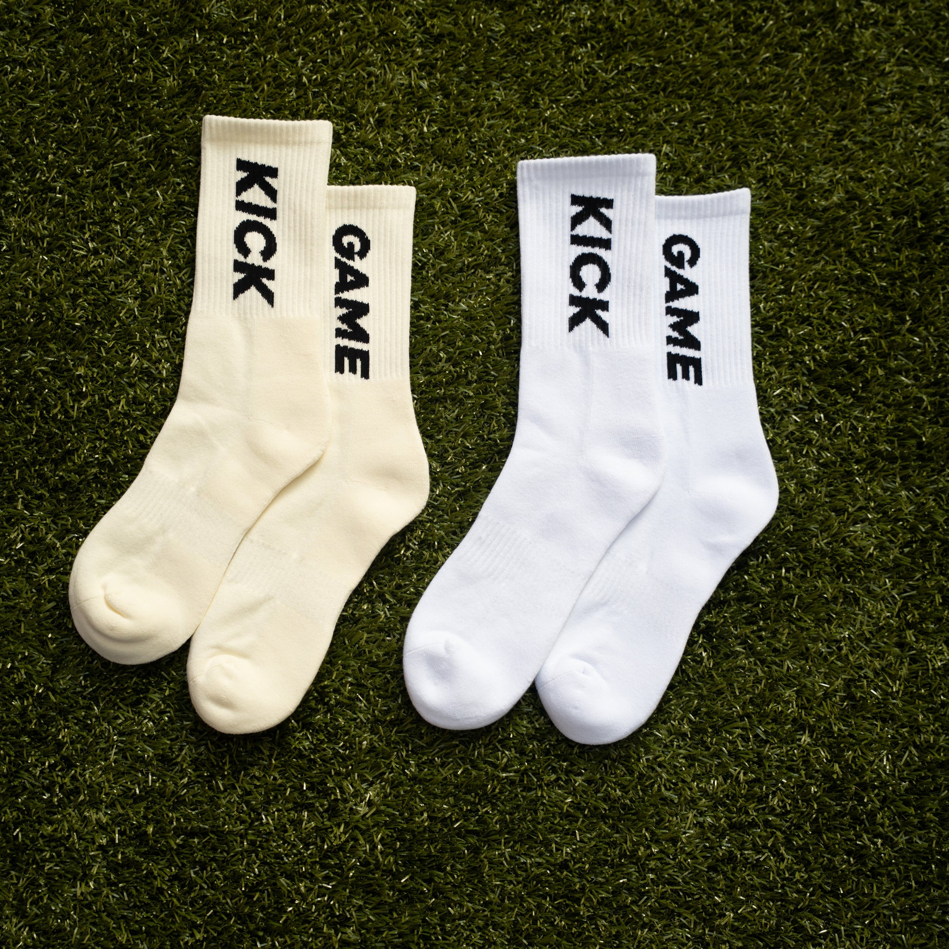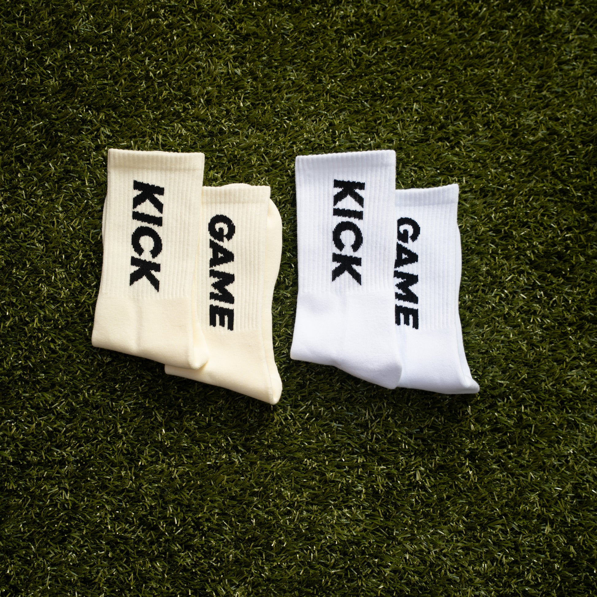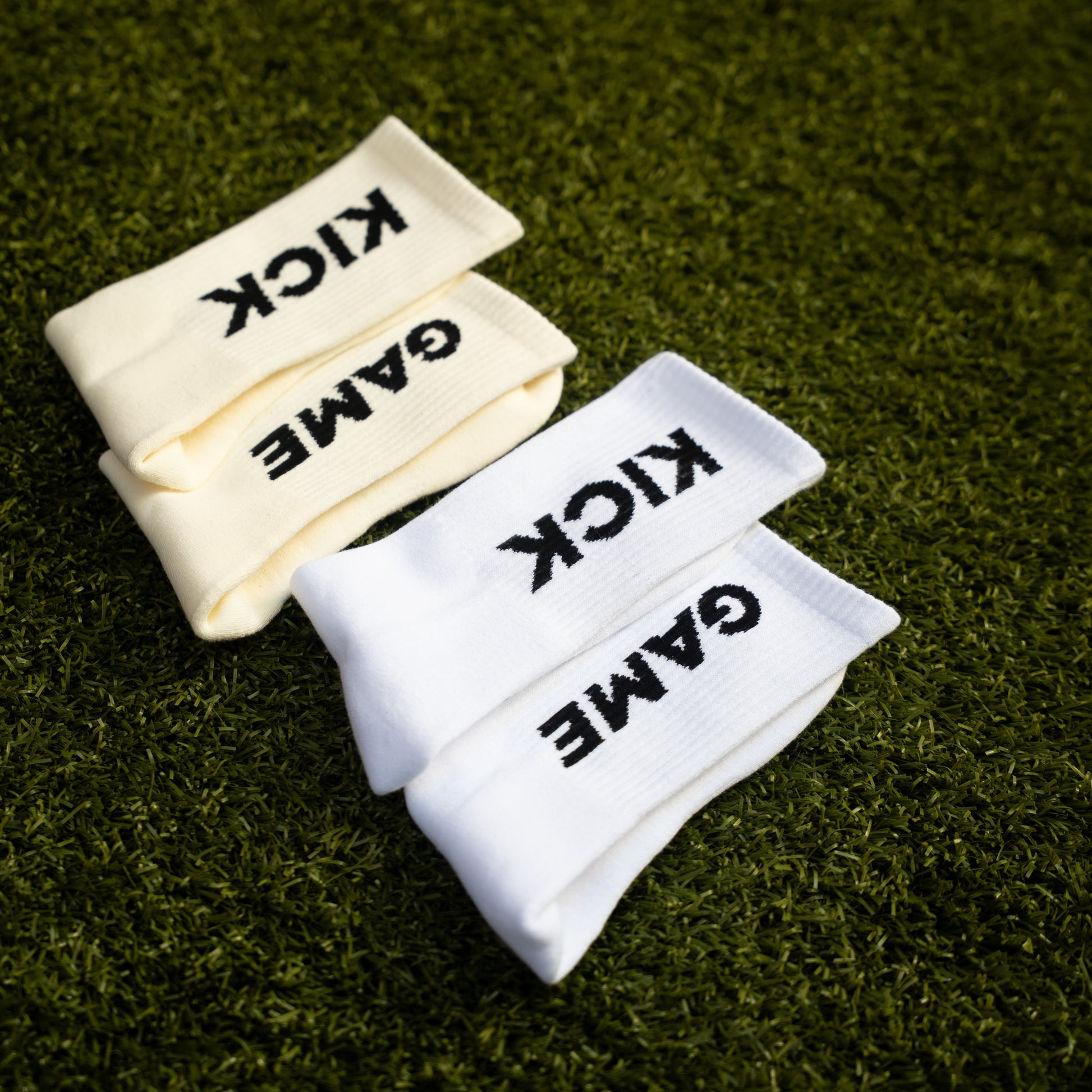 2 PACK OF WHITE + OFF-WHITE SOCKS. THIS IS THE SIGNATURE KICK GAME SOCKS WITH VERTICAL LETTERS. KICK ON THE OUTSIDE OF THE SOCKS + GAME ON THE INSIDE OF THE SOCKS.
