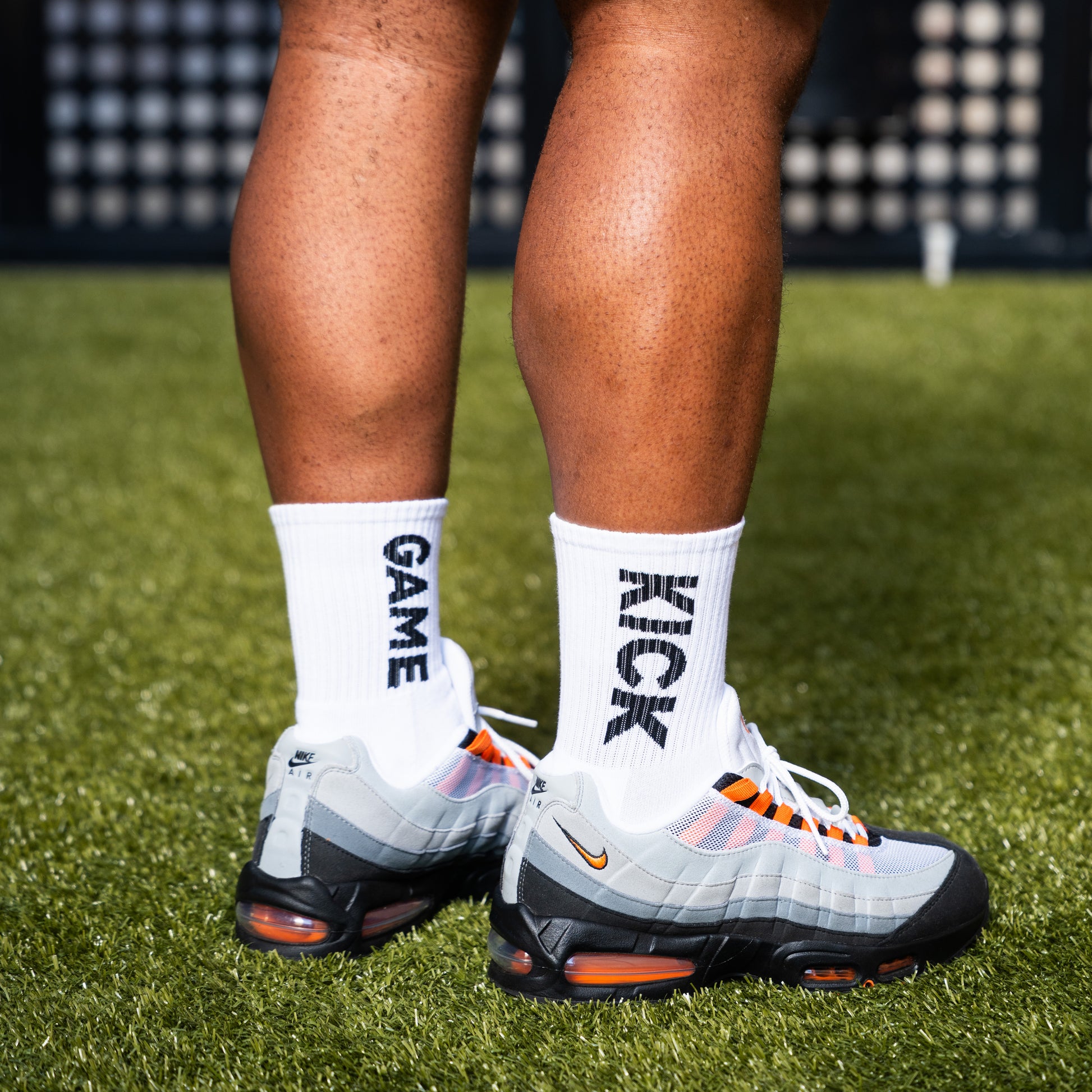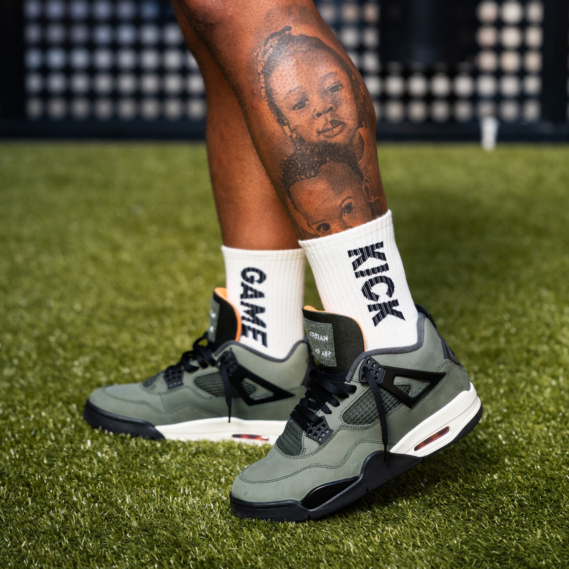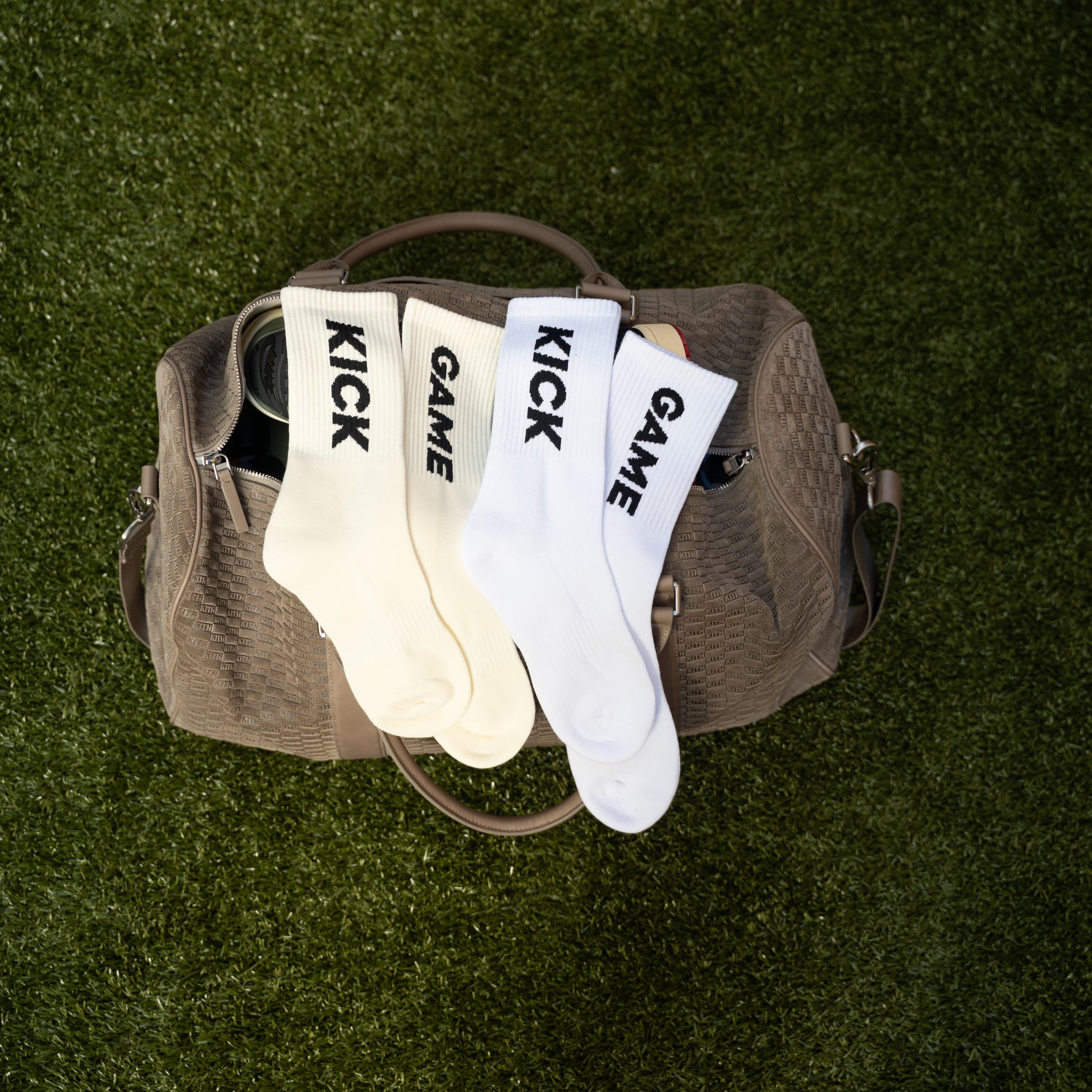 2 PACK OF WHITE + OFF-WHITE SOCKS. THIS IS THE SIGNATURE KICK GAME SOCKS WITH VERTICAL LETTERS. KICK ON THE OUTSIDE OF THE SOCKS + GAME ON THE INSIDE OF THE SOCKS.